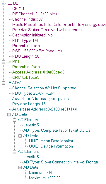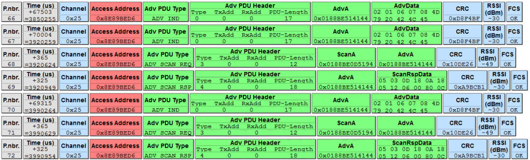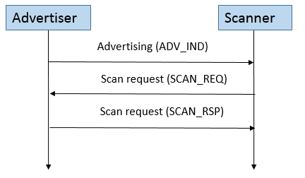 主动扫描:扫描者在接到广播数据(ADV_IND)后,主动发起扫描请求(SCAN_REQ),广播者接到扫描请求回应扫描(SCAN_RSP),扫描回应(SCAN_RSP)也可以携带广播者数据: