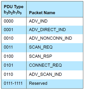 广播类型的PDU包括 16 bits的header 和(0-31)字节的payload,header中最重要的一个字段是PDU Type, Txaddr, RxAddr以及payload都是由PDU type决定其意义的,现在将PDUType的七种情况展开分析: