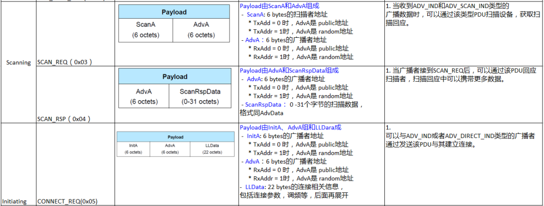 但需要注意的是,扫描者发送SCAN_REQ请求无法携带有效用户数据(参考扫描类型的PDU Payload),因此广播和扫描者之间是单向通信,扫描者能知道广播者信息,但广播者无法知道扫描者信息。