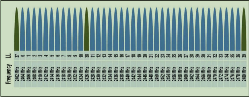 - 2.4G被划分为40个RF信道(f=2402+k*2MHz,k=0, ··· ,39),信道间隔2MHz,其中广播信道3个,固定。数据信道37个,自适应跳频。