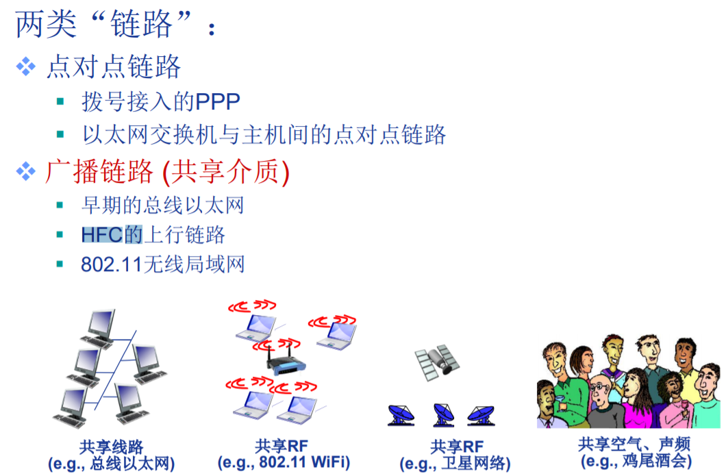 - 如果是共享介质,需要解决信道接入(channel access) 。 接入意思是,谁能用这个共享链路,谁不能用
