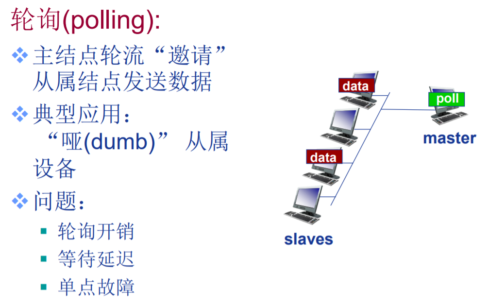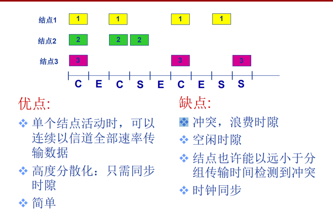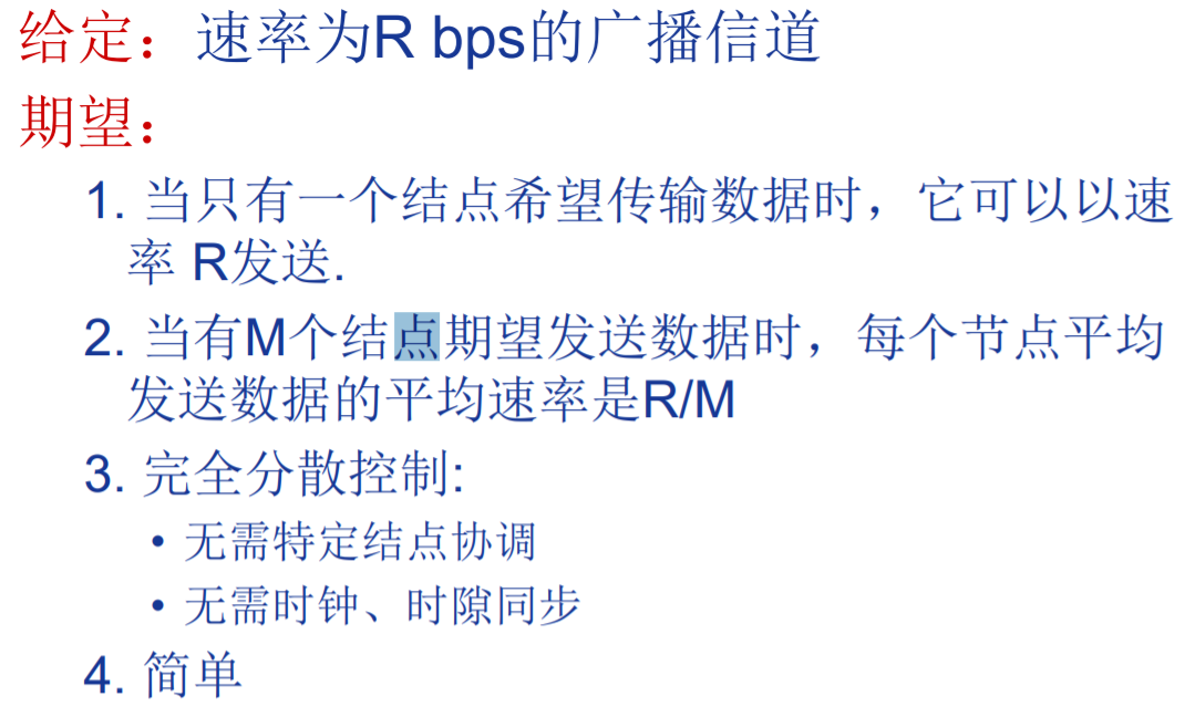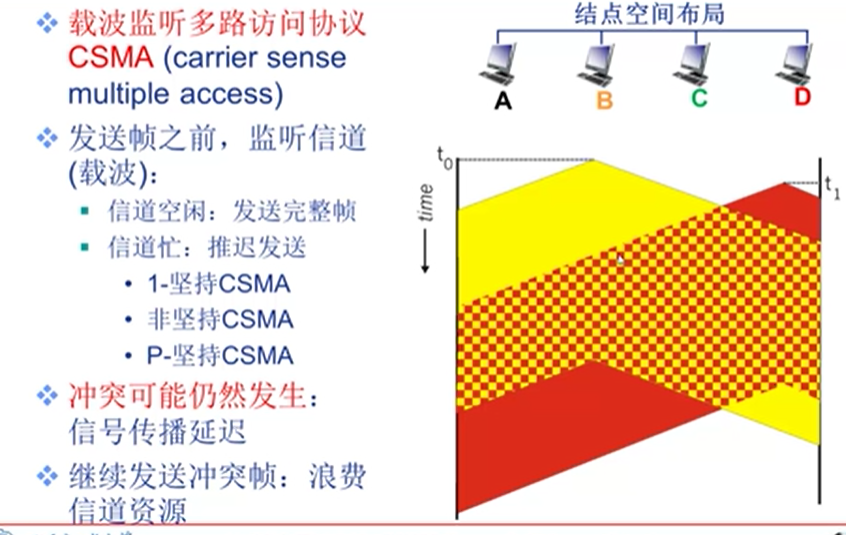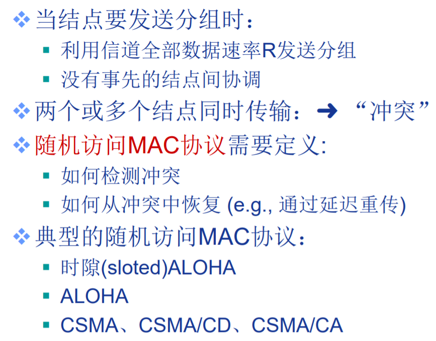 - 随机访问:直接占用整个信道,所以多个结点使用信道,肯定会发生冲突,这种协议一定有冲突恢复机制