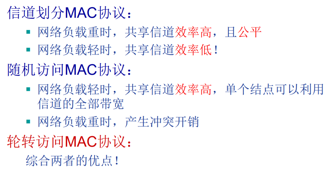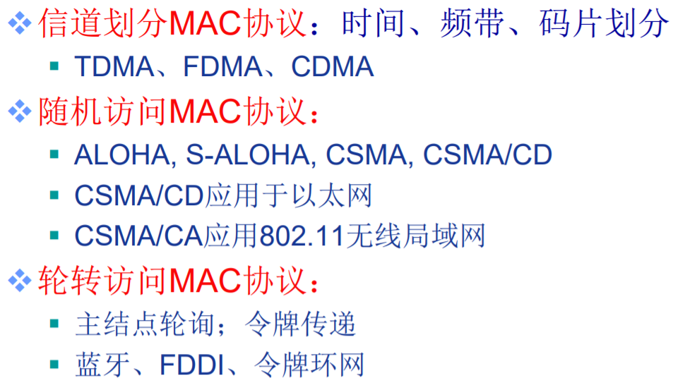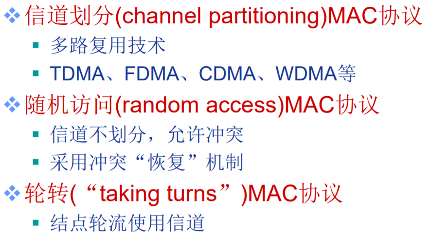 - 信道划分,每个结点按频率、按时间等等方式划分,之前学过多路复用就是按各种方式划分