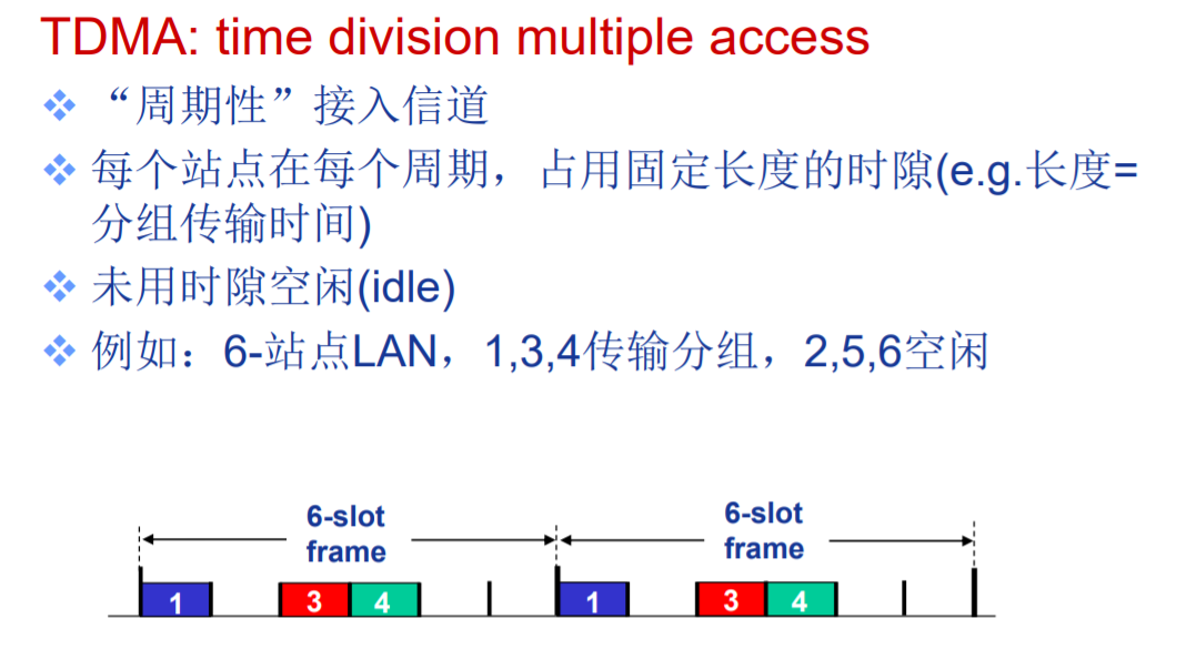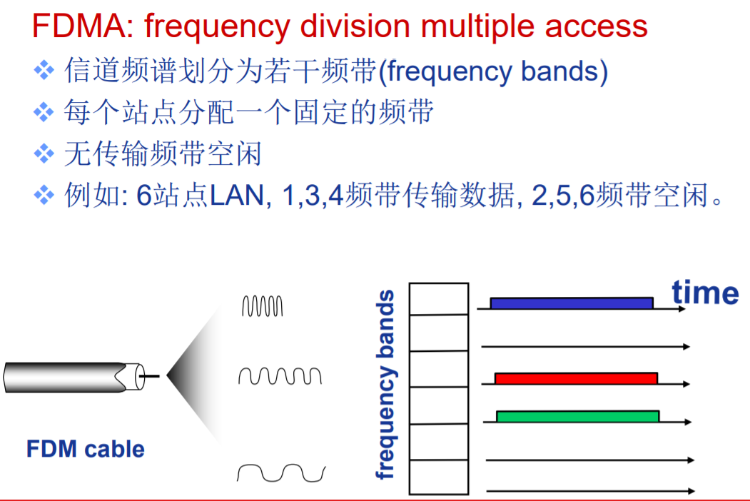 按频带划分,家里的电视网就用FDMA,每个结点都被分配信道,如果不发数据也占用,只是闲着,完全数据隔离没有冲突。
