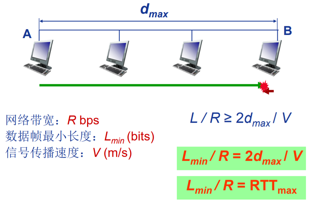 - 这个结论很重要,假设带宽和传播速度都确定了,通过这个方法可以确定最小数据帧长度