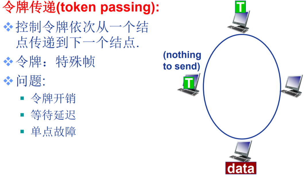 - 谁拿着令牌就可以传输数据,并且负责传输完成,把令牌给下一个。