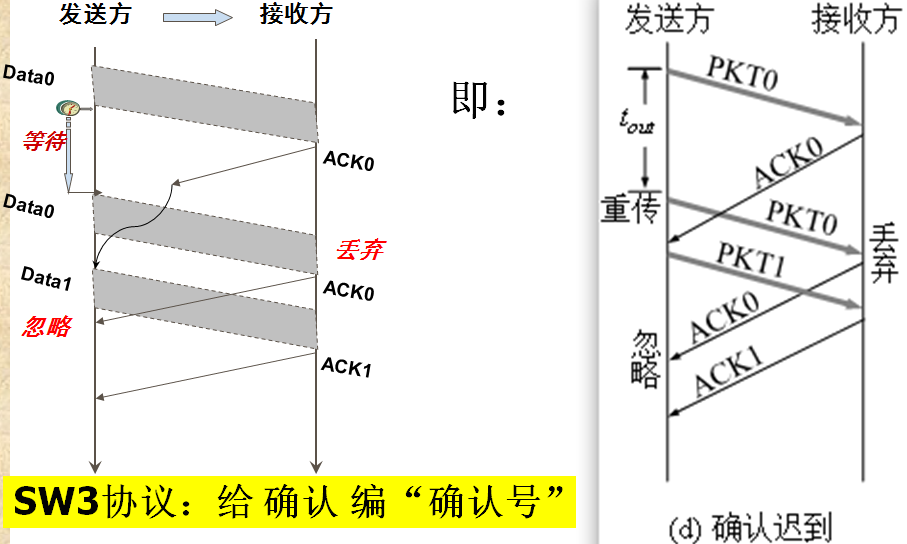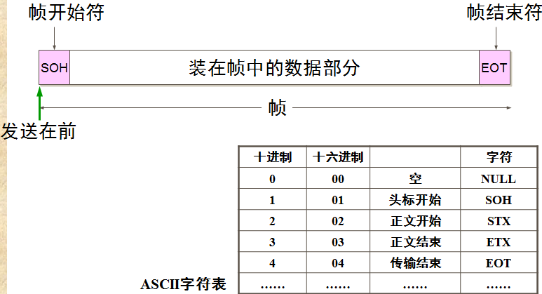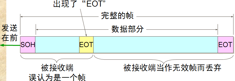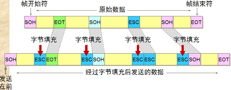 - 发送端的数据链路层在数据中出现控制字符"SOH"或"EOT"的前面插入一个转义字符"ESC"(其十六进制编码是1B)。