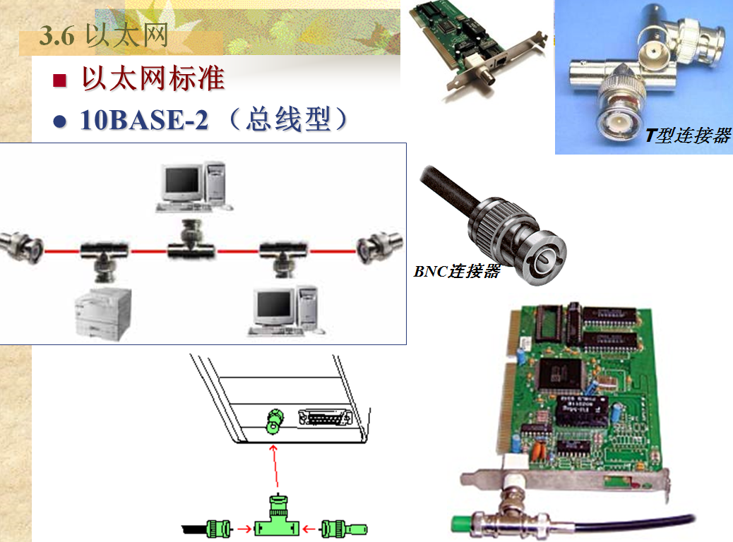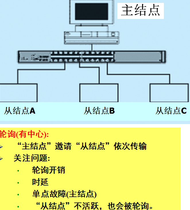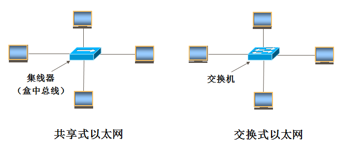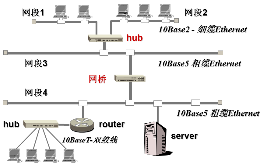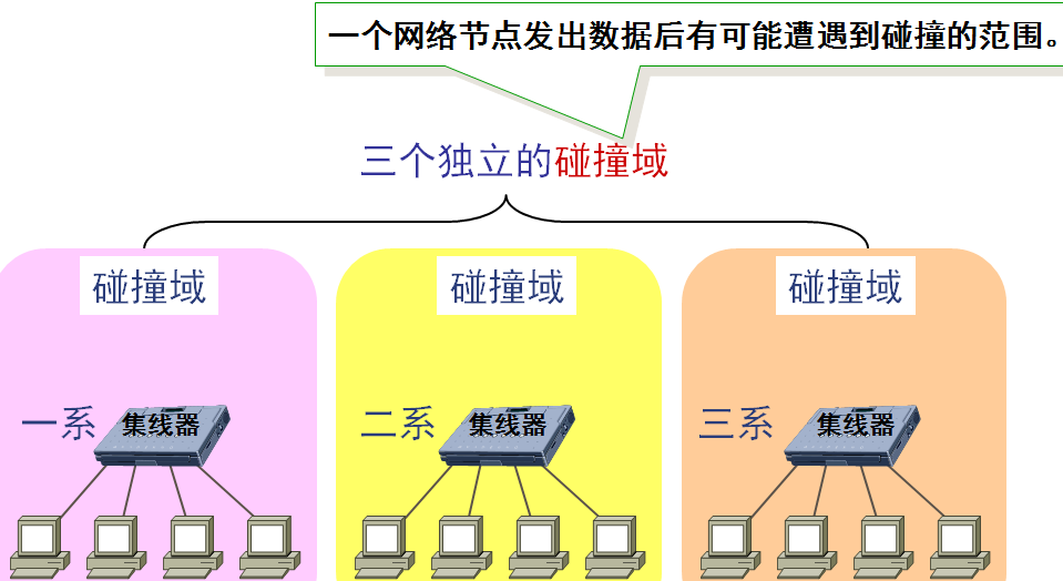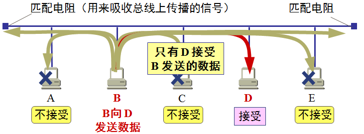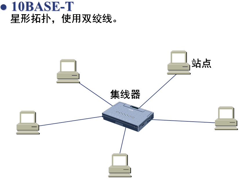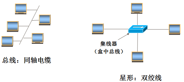 - 总线结构的网络,或者以集线器连接的星形结构的以太网。