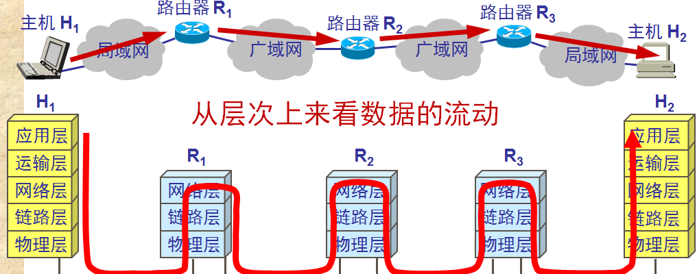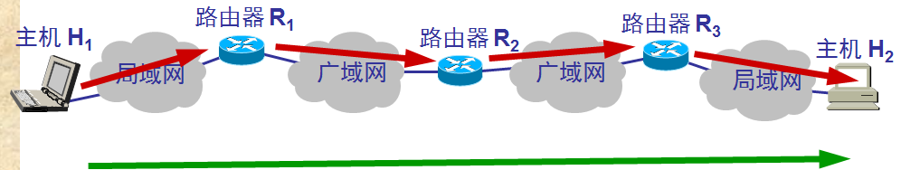 主机H1向H2发送数据(它们沿着端到端路径上的各单段链路进行传输)