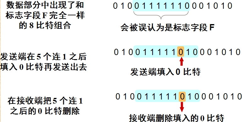 - 接收端对帧中的比特流进行扫描。每当发现5个连续1时,就把这5个连续1后的一个0删除。