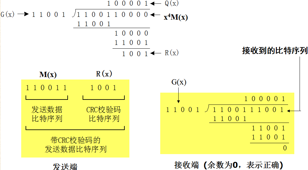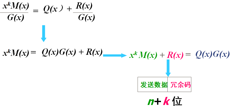 1)设待发送的数据块是n位的二进制多项式M(x),生成多项式为k阶的G(x)(长度为k+1 bit)。在数据块的末尾添加k个0,数据块的长度增加到n+k位,对应的二进制多项式为x^kM(x)。