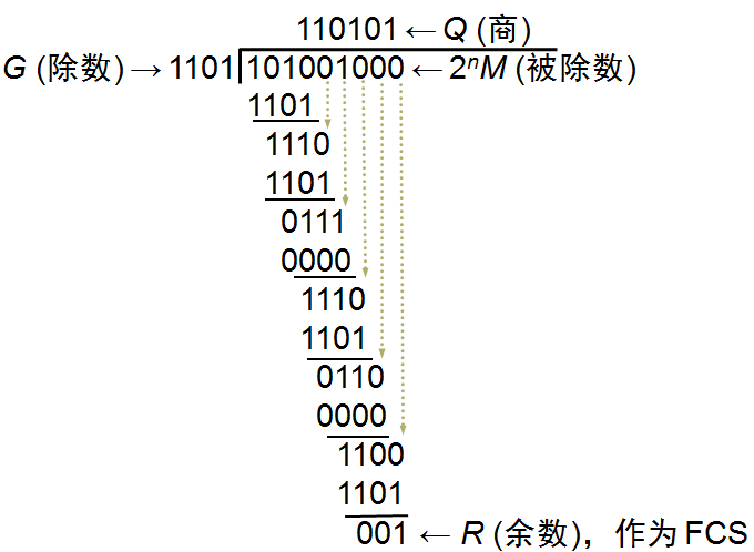 - 假设发送方待传送的一组数据M=101001(现在长度k=6)。我们在M的后面在添加供差错检测用的n位冗余码一起发送。