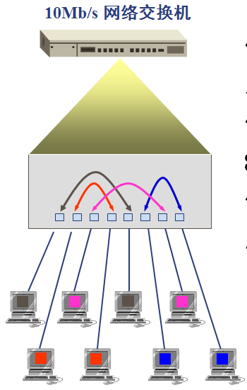 使用交换机后,可建立多个并发的通信。例如:8个端口最多可建立4个并发通信,总带宽=(8/2)x10Mbps=40Mbps