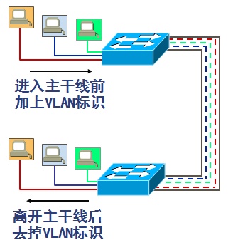 在多台交换机构成的VLAN中,数据帧在发送到交换机之间的干道链路之前,帧会发生一些改变,以标记该帧属于那个VLAN。