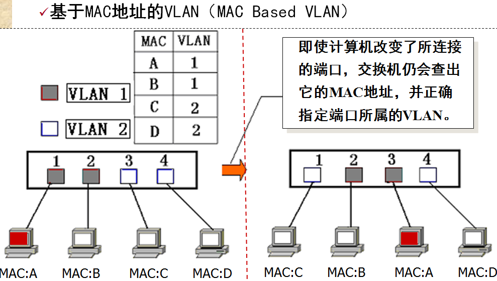 这种划分VLAN的方法是根据每个主机的MAC地址来划分,即对每个MAC地址的主机都配置它属于哪个组。