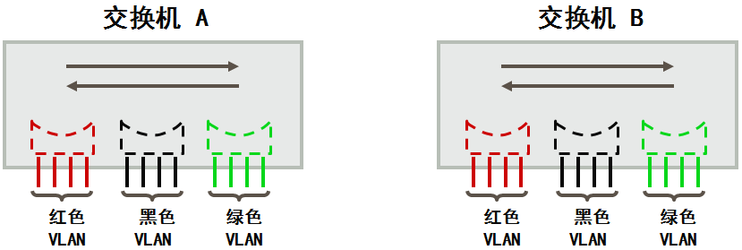 - 属于同一VLAN的端口可以不连续,如何配置由管理员决定,如果有多个交换机的话,例如可以指定交换机1的1-6端口和交换机2的1-4端口为同一VLAN,即同一VLAN可以跨越数个以太网交换机。