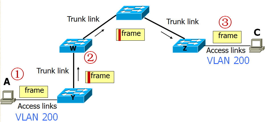 - 交换机Y把标识着VLAN200的字段插入到原以太网帧内,并在干道链路上通过中间交换机发送该数据帧。