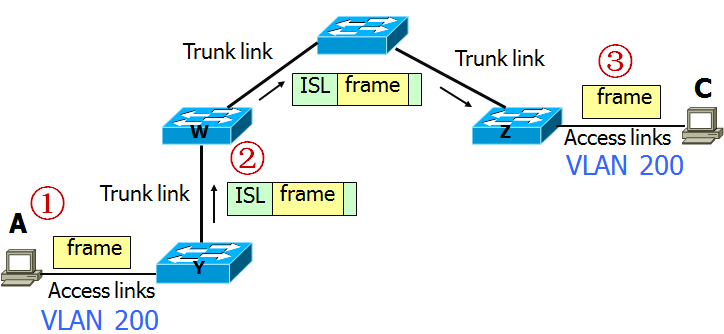 - 交换机Y用标识着VLAN200的一个ISL头封装该数据帧,并在干道链路上通过中间交换机发送该数据帧。