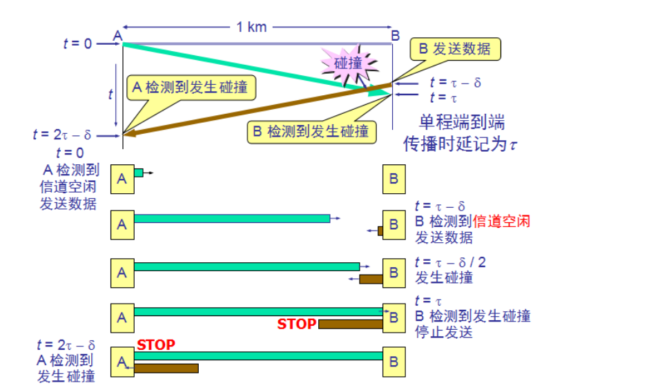 由图可以看出,最先发送数据帧的A站,在发送数据帧后之多经过时间2t就可以知道所发送的数据帧是否遭受了碰撞。因此以太网的端到端往返时间2t称为争用期。争用期又称为碰撞窗口。