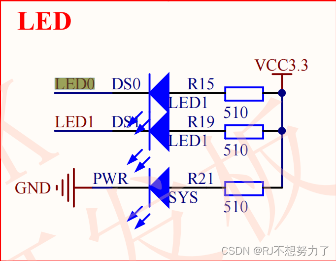 通过观察原理图,可以了解两个LED灯与芯片引脚连接的位置,如下图所示: