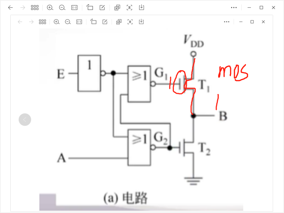 E为1(有效)上面是电源,假设A的输入为1。 标红的地方为mos,就为1,说明本条路是通的。B就是接的电源,输出就为1。如果A输入的为0,就是下面的路有效。自己试试就知道了。E为0 上下路都不通,那就是高阻态数据不能接收