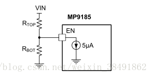 当施加高于EN高门限(1V最大门限)的电压时,MP9185将启动一些内部电路(微功耗模式)。 如果EN电压超过导通阈值(1.23V),MP9185将启用所有功能并开始升压操作。 当EN电压降至其导通阈值(1.23V)以下时,升压切换禁用。 要完全关断MP9185,EN上需要一个<0.4V的低电平电压。 关断后,MP9185从输入功率吸收电流(典型值小于2μA)。 EN兼容高达13V的电压。 为了自动启动,直接将EN连接到VIN。 MP9185具有可编程的UVLO迟滞。 在微功耗模式下上电时,EN从上电阻(R TOP)吸收5μA电流。