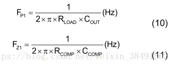 跨导误差放大器(COMP)的输出用于补偿调节控制系统。 系统使用两个极点和一个零点来稳定控制回路。 极点F P1由输出电容(C OUT)和负载电阻设置。 极点F P2从原点开始。 零点F Z1由补偿电容(C COMP)和补偿电阻(R COMP)设定。 这些由式(10)和式(11)确定: