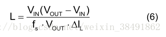 需要电感来传输输入源和输出电容之间的能量。 具有较大值的电感会导致较少的纹波电流和较低的峰值电感电流,从而降低功率MOSFET的压力。 但是,较大值的电感器具有较大的物理尺寸,较高的串联电阻和较低的饱和电流。 对于大多数设计,电感值可以用公式(6)计算: