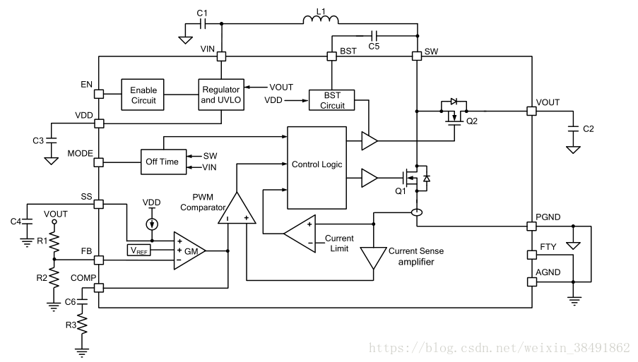 MODE支持在轻载条件下选择脉冲跳跃模式(PSM),强制连续导通模式(FCCM)和超声波模式(USM)。