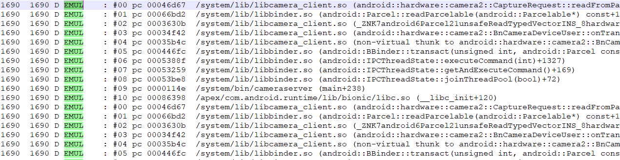 Log中搜索EMUL,得到的栈信息如下,#00代表栈顶,从栈底到栈顶依次为调用链上的每个函数。所在文件和位置也一目了然。