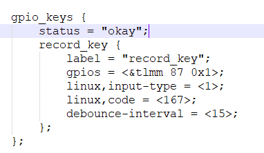 改动如上,找到gpio_key的位置,添加record key,并将gpio pin脚,key code以及debounce更改好,例如上面的键值167,在标准的linux kernel中定义如下: