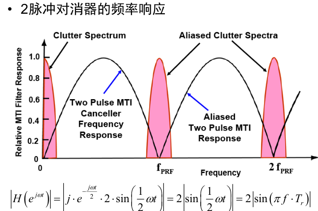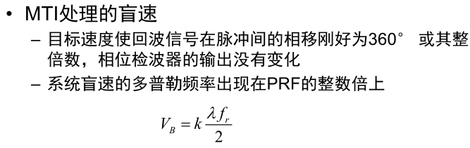 (目标速度使回波信号在脉冲间的相移刚好为360° 或其整倍数,相位检波器的输出没有变化– 系统盲速的多普勒频率出现在PRF的整数倍上)