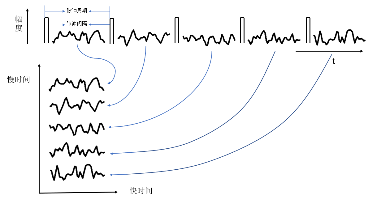 快时间:列;慢时间:行;将一个脉冲重复时间内回波为一行,每行对应不同的PRT。快时间和慢时间在同一时间轴上的不同刻度