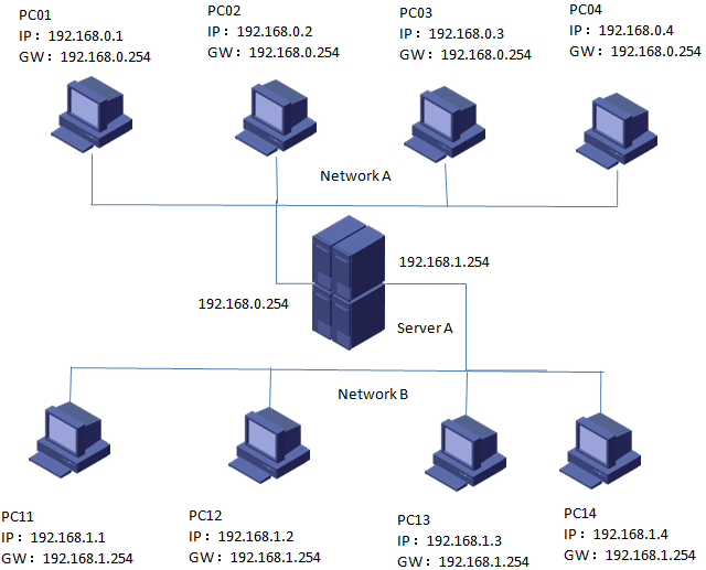 下图共有两个不同的网段分别是NetworkA与NetworkB,这两个网段是通过一个路由器(Server A)来进行数据传递,那么当PC01这台主机想要传送数据到PC11时,它的IP数据包该如何传输?