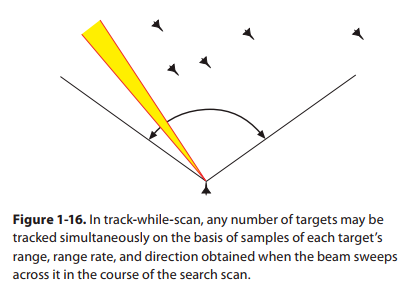 答:1)需要持续对多个目标进行持续跟踪时,使用边扫描边跟踪模式,如图1-16所示,就是边扫描边跟踪模式的一种典型应用情况,机载雷达的波束从左到右周期重复的扫,前方有多个目标,需要连续快速发射多枚导弹,这时候就要使用边扫描边跟踪模式。