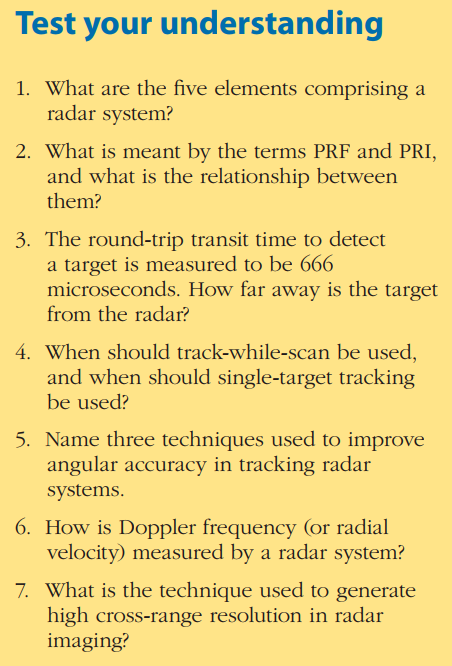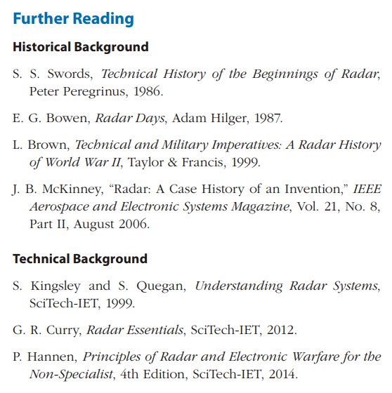 这几个二级标题很有意思,大家都知道汉语的“雷达”这个词是音译词,由英语的RADAR翻译过来,然而RADAR这个单词也是20世纪新造的,它其实是4个单词的缩写,即radio detection and ranging。1.2节和1.3节的名称合起来其实就是解释了RADAR的含义。大家注意range用了ing的形式,这里range是个动词,大家要广义上来理解它,不能仅仅理解为是测距,它其实涵盖了1.3节的所有内容。世界上有很多公司和研究所都用radio(无线电) xxx来取名字,现在再看到这个词的时候你就应当明白这家公司/研究所是搞雷达的,而不是做收音机的。1.2到1.4节建议好好读一遍,这里面已经讲明了雷达最最基本的原理,并且解释了几个专业词汇。
