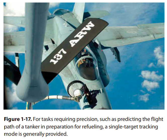 2)需要精确预测目标的航向,得到目标的航迹时,使用单目标跟踪模式。下图中飞机正在进行空中加油,飞机要飞到加油机旁边的时候就要对加油机开启单目标跟踪模式。另外导弹在末制导阶段,为了精确制导,其弹载雷达也是单目标跟踪模式。