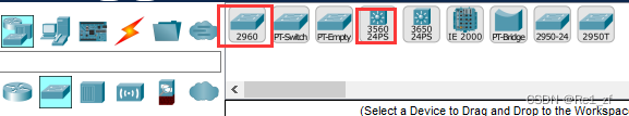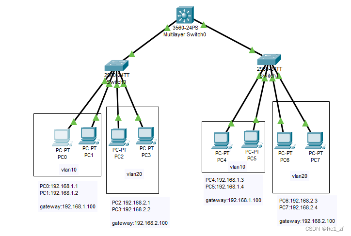 使用设备:PC机、cisco-2960交换机、cisco-3560-24PS交换机(有路由功能的三层交换机)