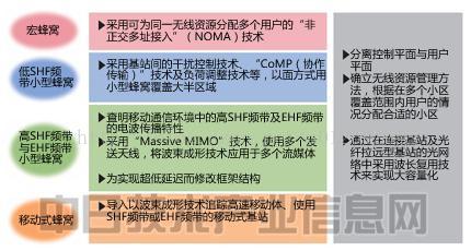 国外关于NOMA的研究已经取得一些可喜的成果,日本NTT DoCoMo公司早在2010年就开始了相关研究,并且已经提出了比较系统化的方案。在NTT DoCoMo提出的5G构想中,各种蜂窝小区中将采用很多新技术(下图)。例如,在使用800MHz频带