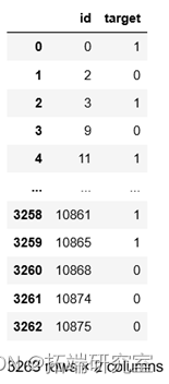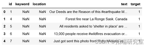 target 仅在train.csv中存在,表示推文中描述灾难的真假,真实为1,虚假为0