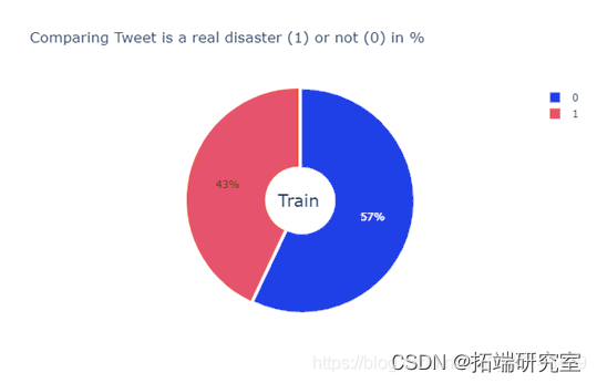 首先,运用plotly绘制真实虚假灾难数量对比的饼图,该饼图描述了正例反例在训练样本中的占比,检验数据平衡性。