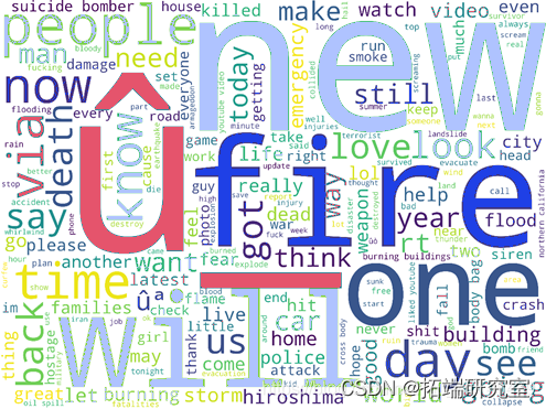 然后,为了进一步了解灾难推文的大致内容,本文利用wordcloud绘制推文的内容的词云。