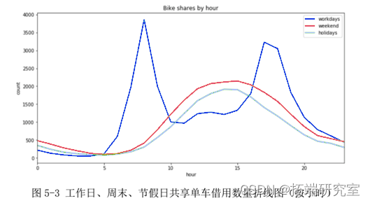 (三)共享单车借用数量:“节假日”与“双休日”中共享单车使用数量的分布较为相似,高峰期均在午后。对比发现,“工作日”中单车使用数量的高峰期在 7 点至 9 点,16 点到 19 点这两个时间段呈现为两个明显的波峰,这两个时间段往往是上班下班时间,人流量比较大,因而数据的呈现比较符合实际的规律。因此,绝对将“is_holiday”列与“is_weekend”列联合进行分组,合并为“is_non_workday”,分为工作组与非工作日组。