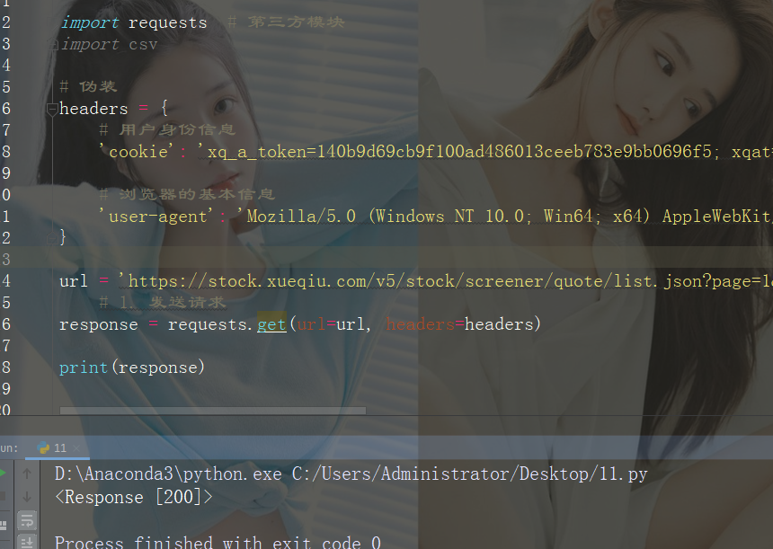 运行后出现 <Response [200]>求请求成功,出现404就是访问不到资源,一般是被反爬了。