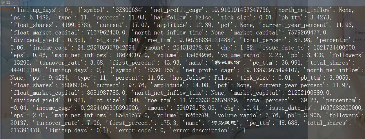 print(symbol, name, current, chg, percent, current_year_percent, volume, amount, turnover_rate, pe_ttm, dividend_yield, market_capital)