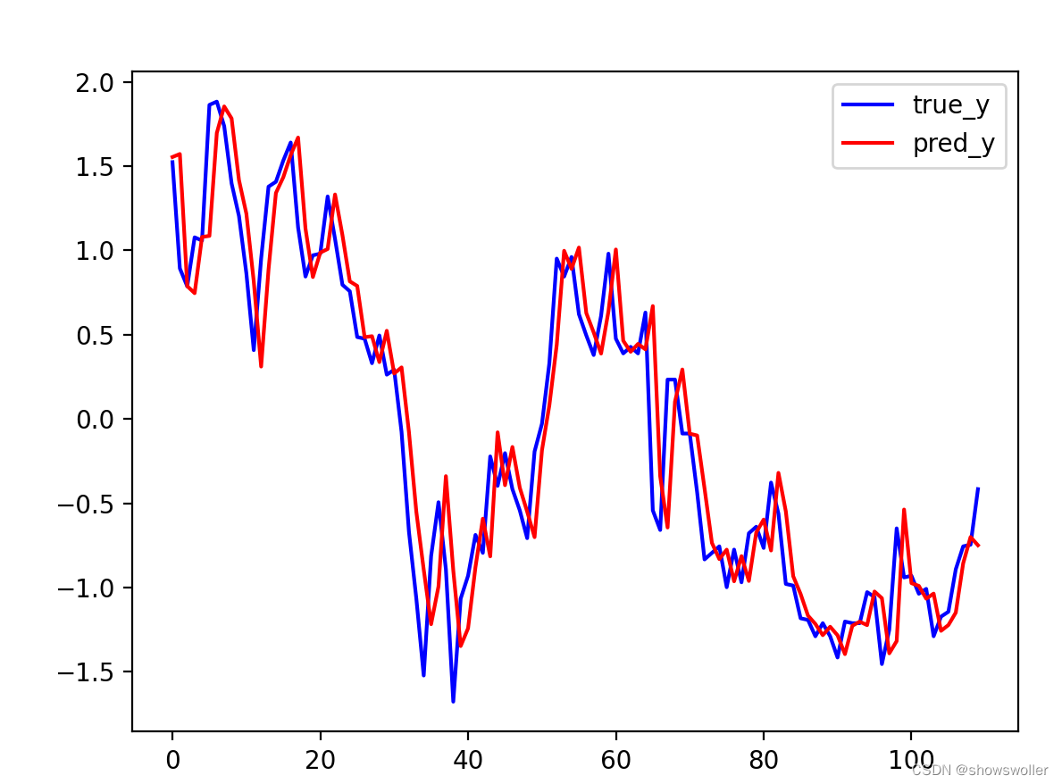2:预测结果如下 红色的是预测值 蓝色的是真实值 可以看出除了某几个极值点正确率较高