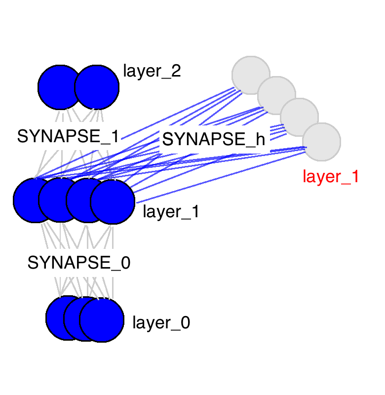 从这张图中能看出来很多东西。这里只有三个权值矩阵,其中两个很相似(名字也一样)。SYNAPSE_0把输入数据传播到隐含层,SYNAPSE_1把隐含层数据传播到输出层。新的矩阵(SYNAPSE_h……要循环的),把隐含层(layer_1)传播到下一个时间点的隐含层(仍旧是layer_1)。