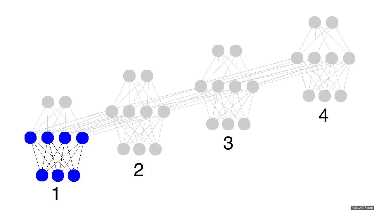 上边的GIF图展现出循环神经网络的奥秘,以及一些非常、非常重要的性质。图中描述了4个时间步数,第一个仅仅受到输入数据的影响,第二个把第二个输入与第一个的隐含层混合,如此继续。有人可能会注意到,在这种方式下,第四个网络“满了”。这样推测的话,第五步不得不选择一个某个节点去替代掉它。是的,这很正确。这就是记忆的“容量”概念。正如你所期望的,更多的隐含层节点能够存储更多的记忆,并使记忆保持更长的时间。同样这也是网络学习去忘记无关的记忆并且记住重要的记忆。你在能从第三步中看出点什么不?为什么有更多的绿色节点呢?