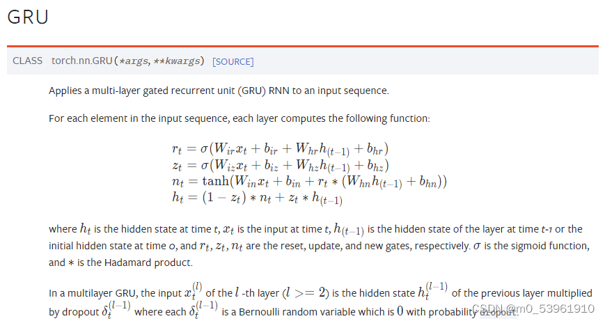 num_layers:堆叠的GRU的层数,num_layers=2说明堆叠了两层GRU,第一层GRU输出的隐藏特征h会作为第二层GRU的数据再进行一次计算。