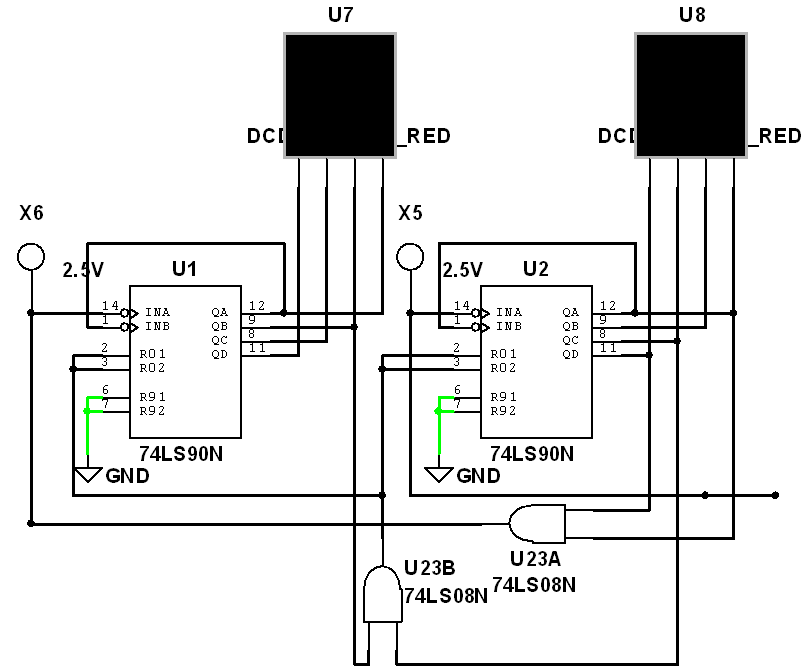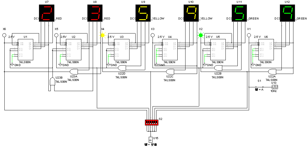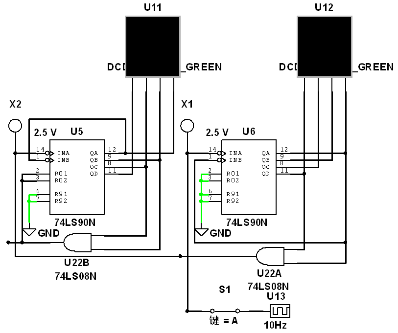 该电路为数字钟的秒计数电路,其使用两个74LS90N计数芯片,接受时钟脉冲的输入,个位和十位的计数器都被设置为10进制计数器,个位的进位信号作为十位计数器的时钟输入信号。